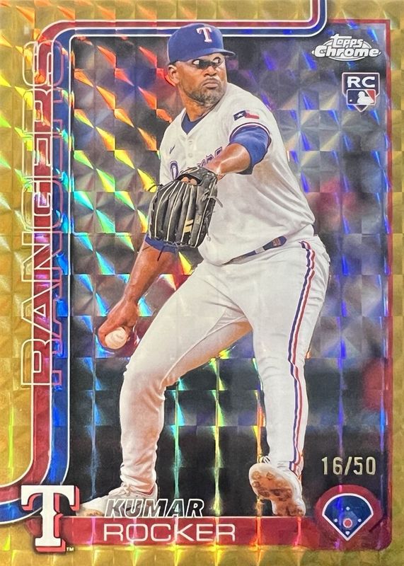 The Kumar Rocker 2025 Topps Chrome #73 Gold Geometric Refractor /50 Rookie card in Raw condition has not changed in price in the last 30 days and was last sold for $6.01 .