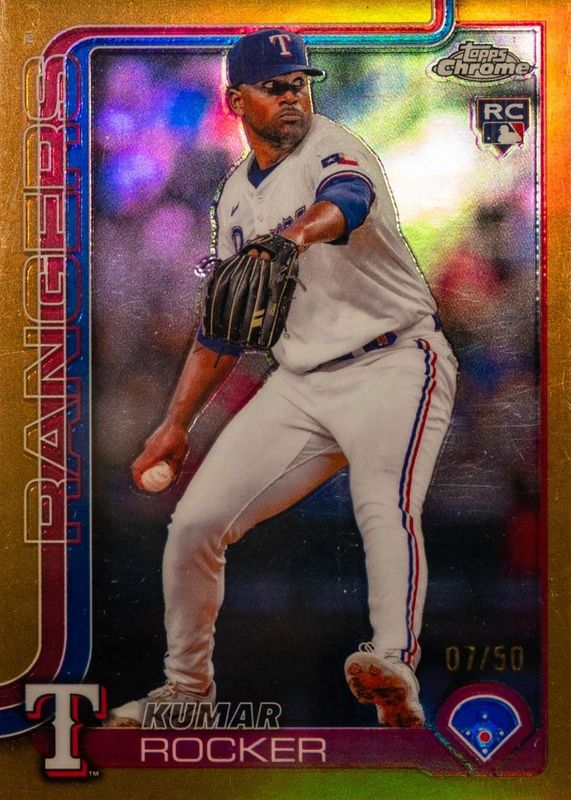 The Kumar Rocker 2025 Topps Chrome #73 Gold Refractor /50 Rookie card in Raw condition has not changed in price in the last 30 days and was last sold for $12.00 .