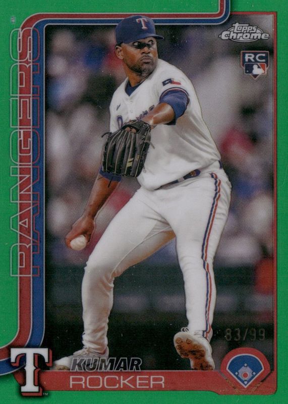 The Kumar Rocker 2025 Topps Chrome #73 Green Refractor /99 Rookie card in Raw condition has moved down -$0.61 (-10.9%) in the last 30 days and was last sold for $4.99 .