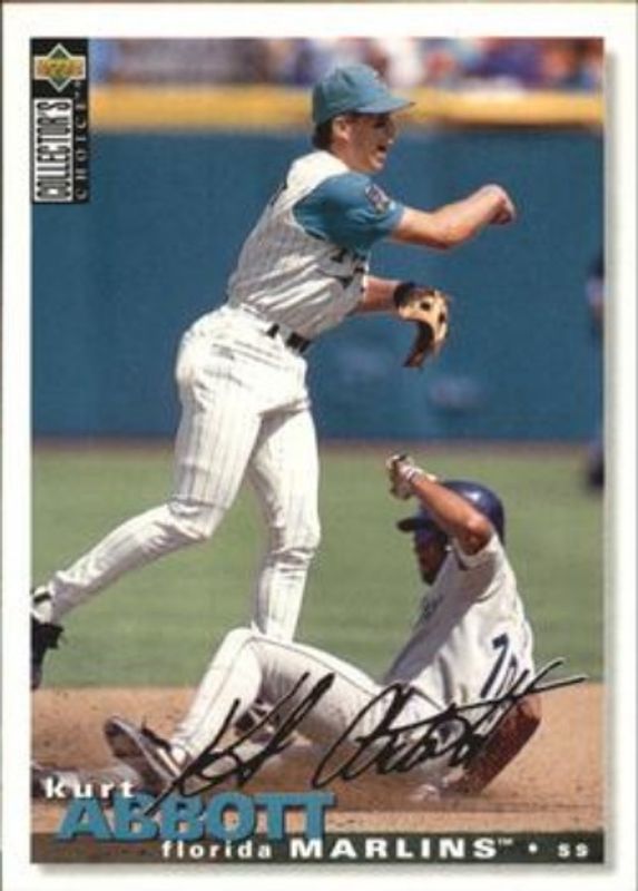 The Kurt Abbott 1995 Upper Deck Collector's Choice #303 Silver Signatures card is 1 of 3 Kurt Abbott's card variations in the 1995 Upper Deck Collector's Choice set being tracked by Sports Card Investor, including Base, and Gold Signatures.