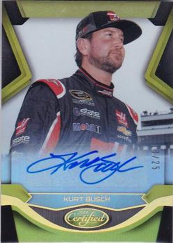 The Kurt Busch 2016 Certified NASCAR #KU Certified Signatures - Mirror Gold /25 card is 1 of 45 Kurt Busch's card variations in the 2016 Certified NASCAR set being tracked by Sports Card Investor, including Base /99, Mirror Red /25, Mirror Blue /20, Mirror Gold /15, and Mirror Orange /15.