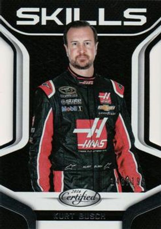 The Kurt Busch 2016 Certified NASCAR #S11 Skills /199 card is 1 of 45 Kurt Busch's card variations in the 2016 Certified NASCAR set being tracked by Sports Card Investor, including Base /99, Mirror Red /25, Mirror Blue /20, Mirror Gold /15, and Mirror Orange /15.