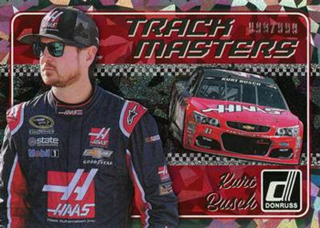 The Kurt Busch 2017 Donruss NASCAR #TM10 Track Masters Cracked Ice /999 card is 1 of 68 Kurt Busch's card variations in the 2017 Donruss NASCAR set being tracked by Sports Card Investor, including #11 Base, #48b Base, #48a Base, #175 Base, and #128 Base.