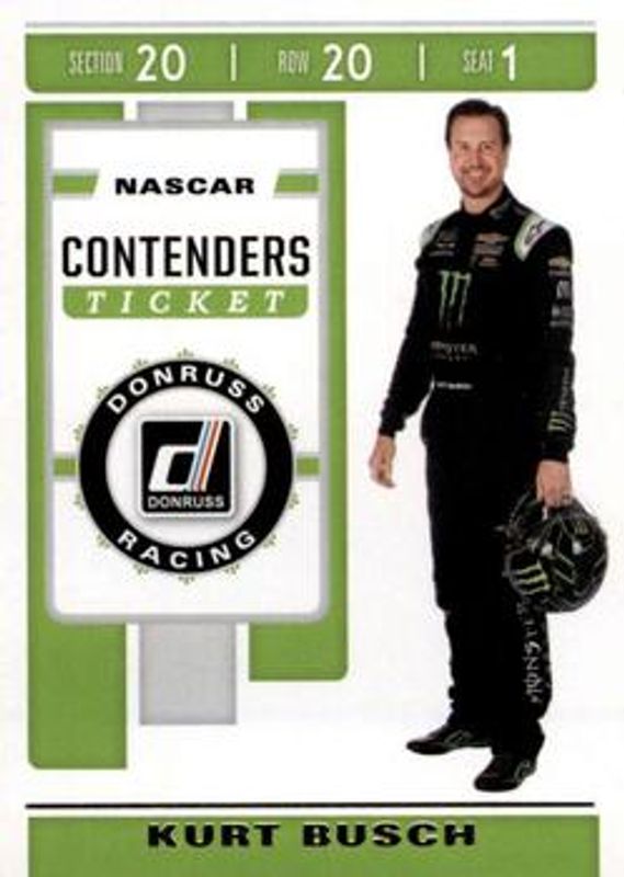 The Kurt Busch 2020 Donruss NASCAR #C14 Contenders Ticket card is 1 of 104 Kurt Busch's card variations in the 2020 Donruss NASCAR set being tracked by Sports Card Investor, including #112 Base, #161 Base, #189 Base, #41 Base, and #41 Carolina Blue.