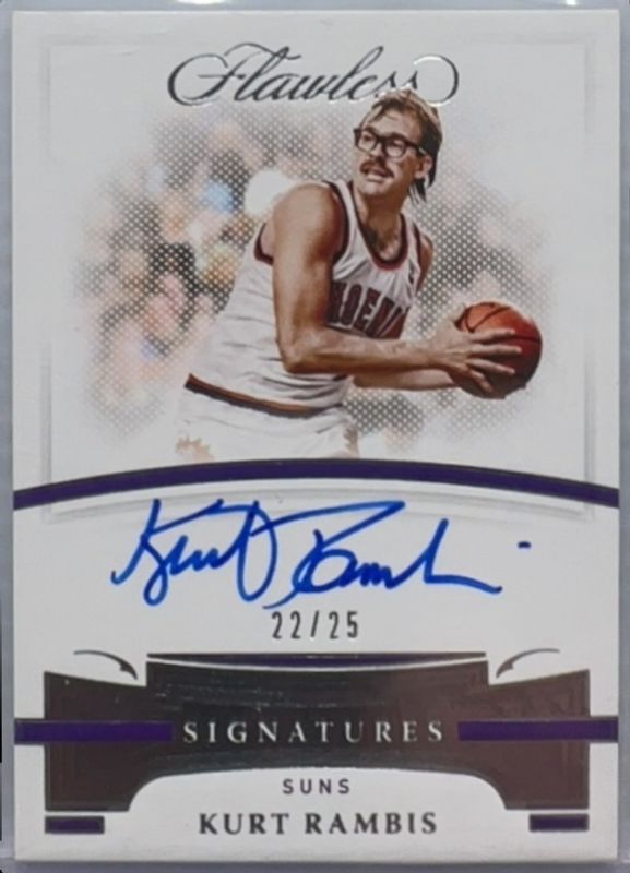 The Kurt Rambis 2020 Flawless #AUT-RAM Flawless Autographs /25 card is 1 of 12 Kurt Rambis' card variations in the 2020 Flawless set being tracked by Sports Card Investor, including Distinguished Autos /25, Distinguished Autos - Ruby /15, Flawless Autographs - Ruby /15, Distinguished Autos - Gold /10, and Flawless Autographs - Gold /10.