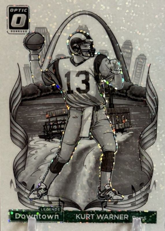 This card is 1 of 5 Kurt Warner's card variations in the 2024 Optic set being tracked by Sports Card Investor, including Downtown Legends /(SSP), Downtown Legends - Black Pandora /25, Downtown Legends - Gold /10, and Downtown Legends - Gold Vinyl /1.