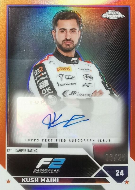 2023 Topps Chrome Formula 1 F1 F2 Kush Maini Auto #CAC-KMI Orange /25
