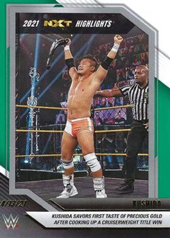 The Kushida 2022 Panini WWE NXT #13 2021 NXT Highlights - Green card is 1 of 28 Kushida's card variations in the 2022 Panini WWE NXT set being tracked by Sports Card Investor, including #13 2021 NXT Highlights, #21 2021 NXT Highlights, #18 2021 NXT Highlights, #17 2021 NXT Highlights, and #21 2021 NXT Highlights - Green.