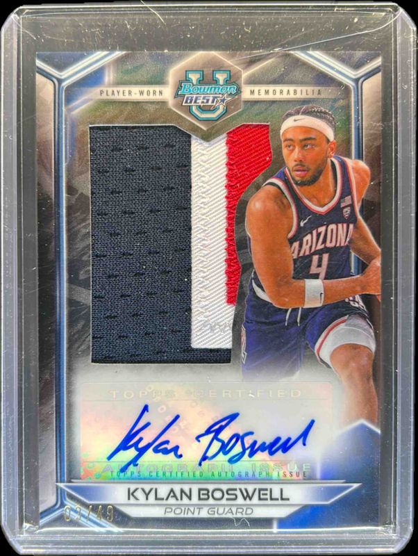 The Kylan Boswell 2023 Bowman Best University #PJR-KB Prospect Jumbo Relic Autographs - Honor Roll /49 card is 1 of 54 Kylan Boswell's card variations in the 2023 Bowman Best University set being tracked by Sports Card Investor, including Base, Refractor, Speckle Refractor, Blue Refractor /150, and Pink Lava Refractor /100.