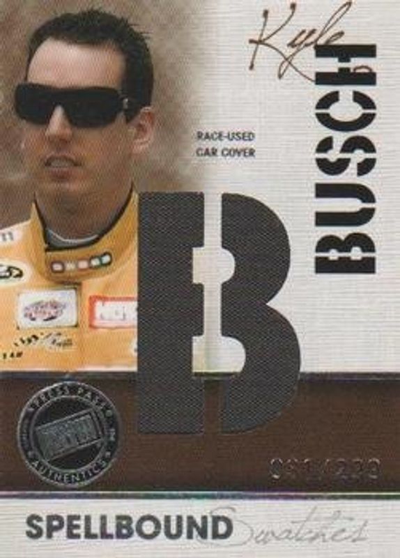 The Kyle Busch 2010 Press Pass Eclipse #SS-KB1 Spellbound Swatches /120 card is 1 of 45 Kyle Busch's card variations in the 2010 Press Pass Eclipse set being tracked by Sports Card Investor, including #83 Base, #19 Base, #19 Gallery Edition, #83 Gallery Edition, and #19 Gold.