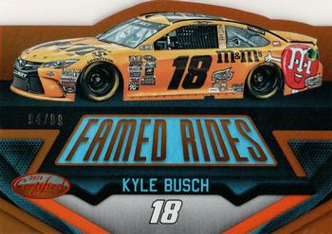 The Kyle Busch 2016 Certified NASCAR #FR11 Famed Rides - Mirror Orange /99 card is 1 of 93 Kyle Busch's card variations in the 2016 Certified NASCAR set being tracked by Sports Card Investor, including #2 Base /99, #55 Base /99, #55 Mirror Red /25, #2 Mirror Red /25, and #55 Mirror Blue /20.