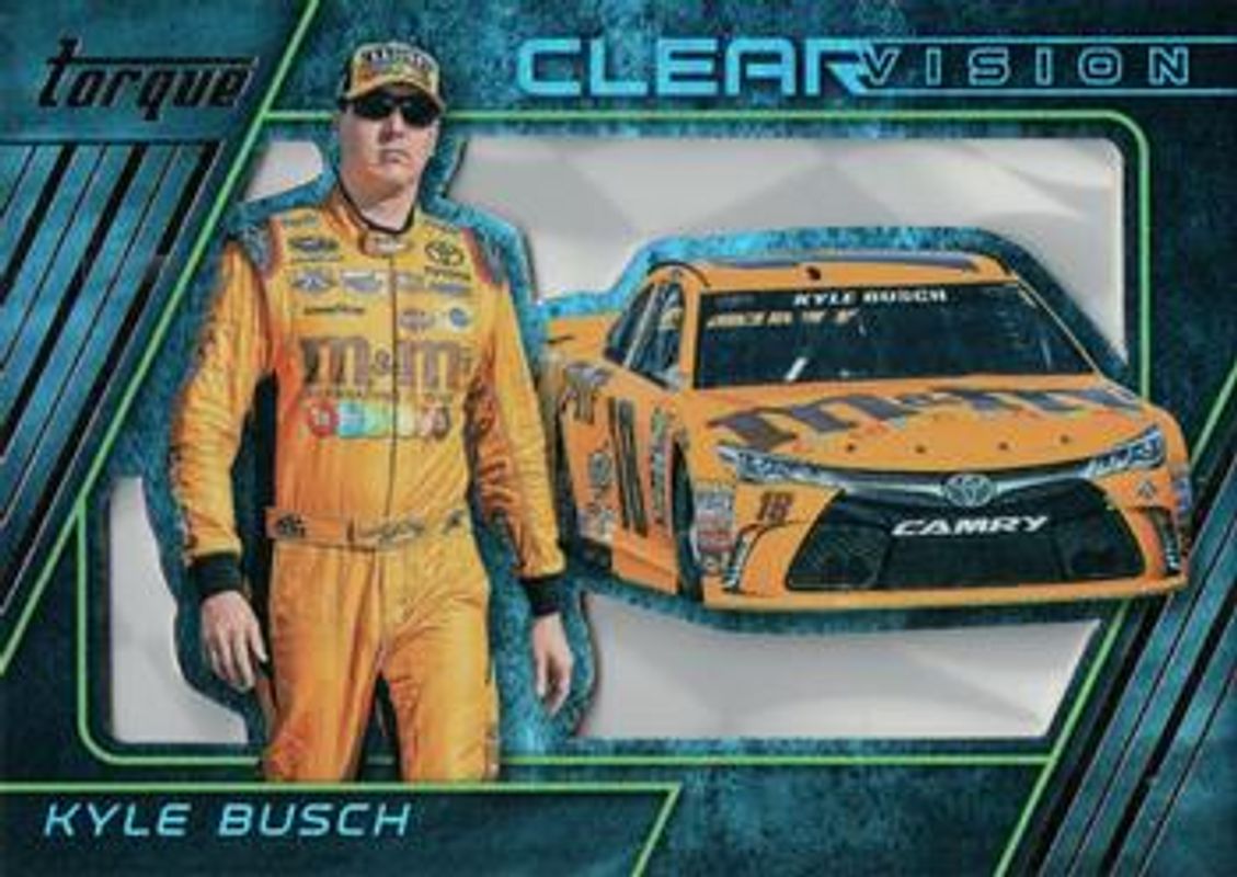 The Kyle Busch 2016 Torque NASCAR #7 Clear Vision card is 1 of 147 Kyle Busch's card variations in the 2016 Torque NASCAR set being tracked by Sports Card Investor, including #56 Base, #84 Base, #72 Base, #7 Base, and #56 Gold.