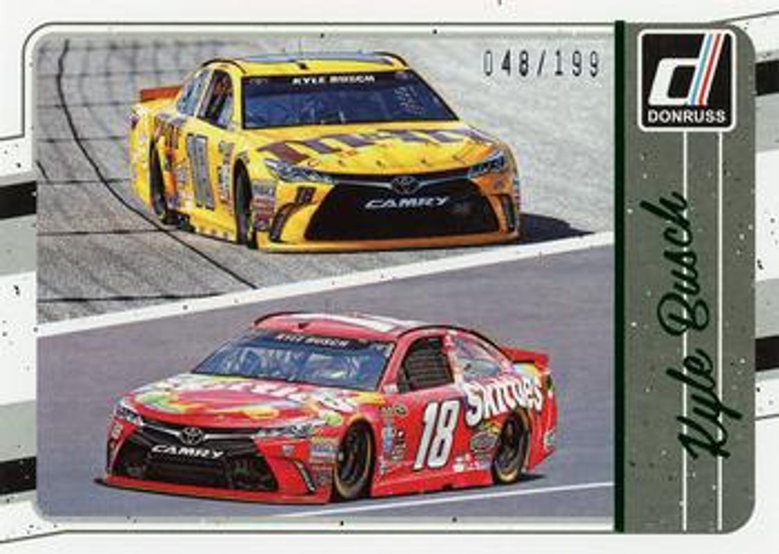 The Kyle Busch 2017 Donruss NASCAR #103 Green Foil /199 card is 1 of 96 Kyle Busch's card variations in the 2017 Donruss NASCAR set being tracked by Sports Card Investor, including #95 Base, #103 Base, #123 Base, #157 Base, and #2 Base.