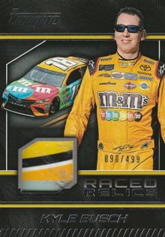 The Kyle Busch 2017 Torque NASCAR #RR-KY Raced Relics /499 card is 1 of 150 Kyle Busch's card variations in the 2017 Torque NASCAR set being tracked by Sports Card Investor, including #8 Base, #85 Base, #94 Base, #94 Gold, and #8 Gold.