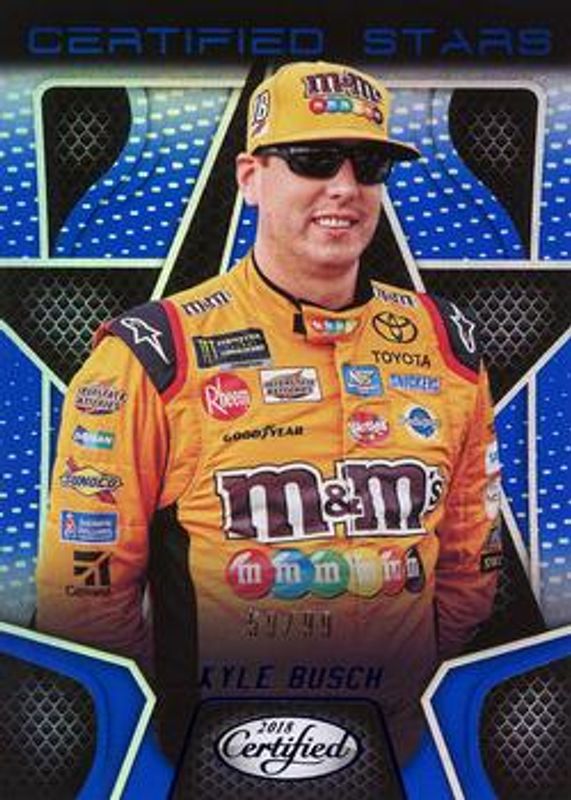 The Kyle Busch 2018 Certified NASCAR #CS12 Certified Stars - Blue /99 card is 1 of 91 Kyle Busch's card variations in the 2018 Certified NASCAR set being tracked by Sports Card Investor, including Base /149, Orange /249, Mirror Gold /25, Red /25, and Blue /20.