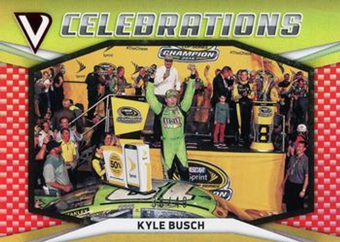 The Kyle Busch 2018 Victory Lane NASCAR #C10 Celebrations Red /49 card is 1 of 142 Kyle Busch's card variations in the 2018 Victory Lane NASCAR set being tracked by Sports Card Investor, including #96 Base, #12 Base, #42 Base, #43 Base, and #47 Base.