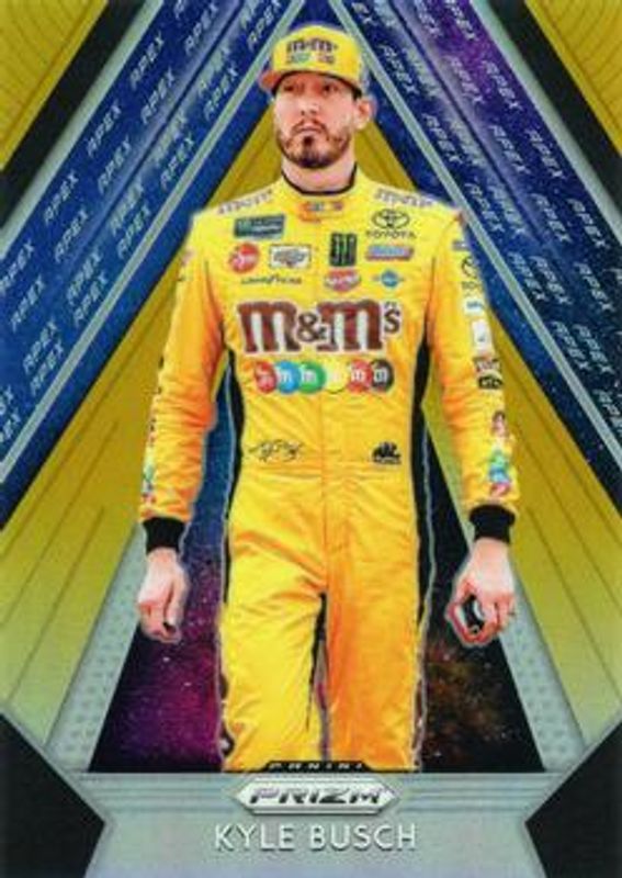 The Kyle Busch 2019 Prizm NASCAR #A-9 Apex Gold /10 card is 1 of 120 Kyle Busch's card variations in the 2019 Prizm NASCAR set being tracked by Sports Card Investor, including #76 Base, #67 Base, #83 Base, #15a Base, and #15b Base.
