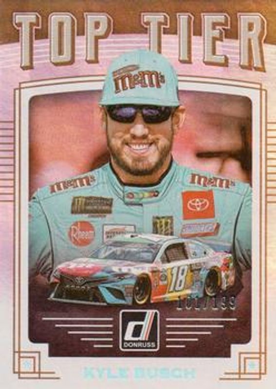 The Kyle Busch 2020 Donruss NASCAR #TT-7 Top Tier Holographic /199 card is 1 of 148 Kyle Busch's card variations in the 2020 Donruss NASCAR set being tracked by Sports Card Investor, including #182 Base, #102 Base, #42 Base, #5 Base, and #196 Base.