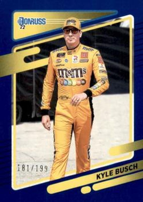 The Kyle Busch 2022 Donruss NASCAR #71 Navy Blue /199 card is 1 of 174 Kyle Busch's card variations in the 2022 Donruss NASCAR set being tracked by Sports Card Investor, including #6 Base, #71 Base, #184 Base, #134 Base, and #46 Base.