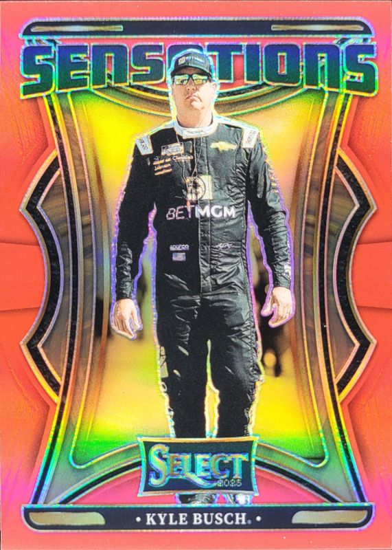 The Kyle Busch 2025 Select NASCAR #19 Sensations Red /99 card is 1 of 138 Kyle Busch's card variations in the 2025 Select NASCAR set being tracked by Sports Card Investor, including Base Pit Road, Base Pit Road Orange Flash, Base Pit Road Orange Ice, Base Pit Road Silver, and Base Pit Road Tri-Color.