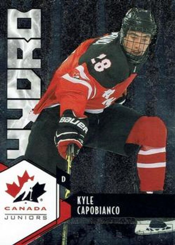 The Kyle Capobianco 2015 Upper Deck Team Canada Juniors #H-11 Hydro card is 1 of 17 Kyle Capobianco's card variations in the 2015 Upper Deck Team Canada Juniors set being tracked by Sports Card Investor, including Base, Gold, Exclusives /199, High Gloss /25, and Printing Plates Black /1.