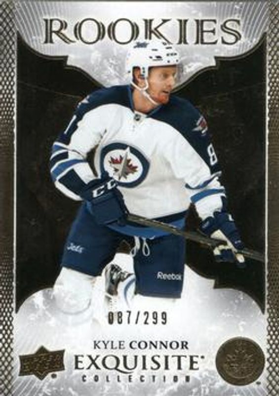 The Kyle Connor 2016 Upper Deck Ice #R-4 2016 Upper Deck Exquisite Collection Rookies /299 card is 1 of 15 Kyle Connor's card variations in the 2016 Upper Deck Ice set being tracked by Sports Card Investor, including Base /1299, Ice Premieres die-cut /999, Fresh Threads, SubZero, and Ice Premieres Autographs /299.