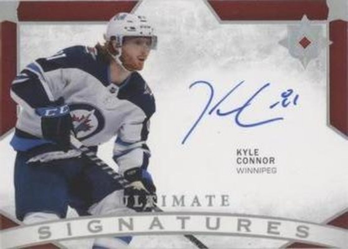 The Kyle Connor 2021 Upper Deck Ultimate Collection #US-KC Ultimate Signatures card is 1 of 28 Kyle Connor's card variations in the 2021 Upper Deck Ultimate Collection set being tracked by Sports Card Investor, including Base /299, Gold /35, Purple /15, Black /5, and 2000 Ultimate Signatures Retro.