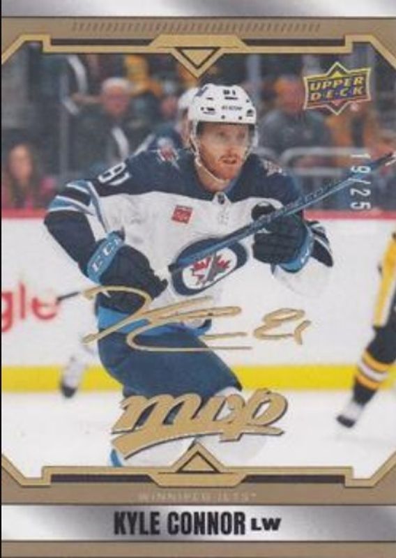 The Kyle Connor 2024 Upper Deck MVP #MR-1 10th Anniversary - Super Script /25 card is 1 of 15 Kyle Connor's card variations in the 2024 Upper Deck MVP set being tracked by Sports Card Investor, including Base, Gold Script, Silver Script, Super Script /25, and Printing Plates Black /1.