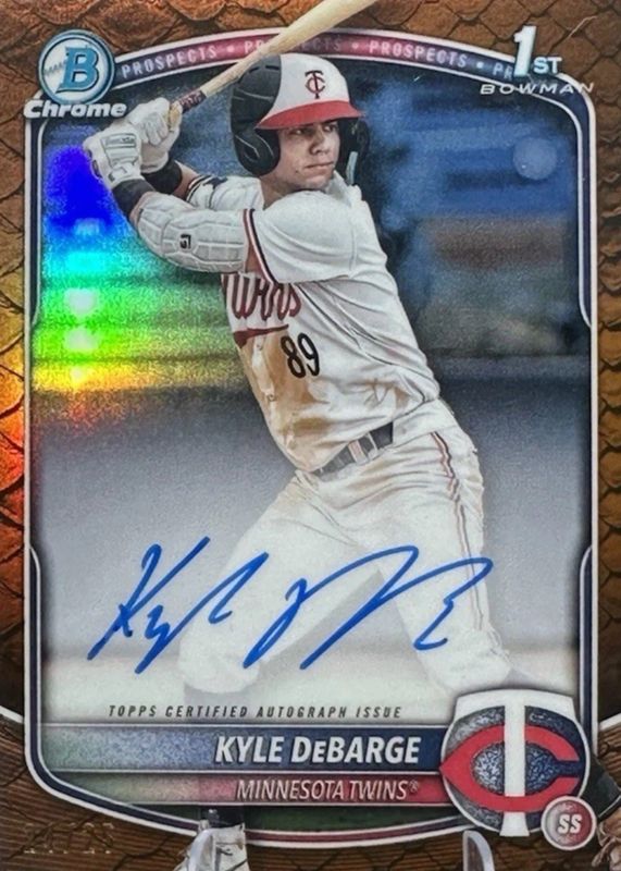 The Kyle DeBarge 2025 Bowman #CPA-KD Chrome Prospect Auto - Reptilian Orange Refractor /25 (1st) card in Raw condition has not changed in price in the last 30 days and was last sold for $80.00 .