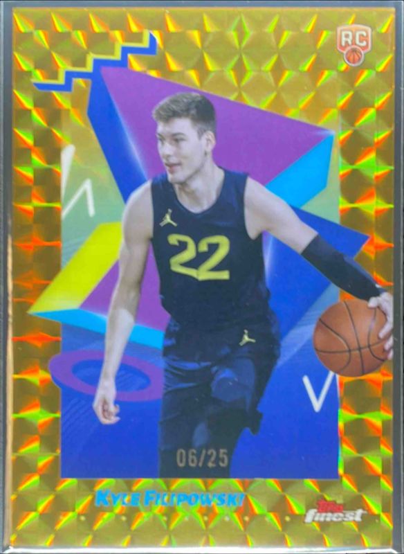 The Kyle Filipowski 2024 Topps Finest #195 Base Uncommon - Gold Geometric Refractor /25 Rookie card is 1 of 116 Kyle Filipowski's card variations in the 2024 Topps Finest set being tracked by Sports Card Investor, including Arrivals, Arrivals - Geometric Refractor, Arrivals - Refractor, Arrivals - X-Fractor, and Base Common.