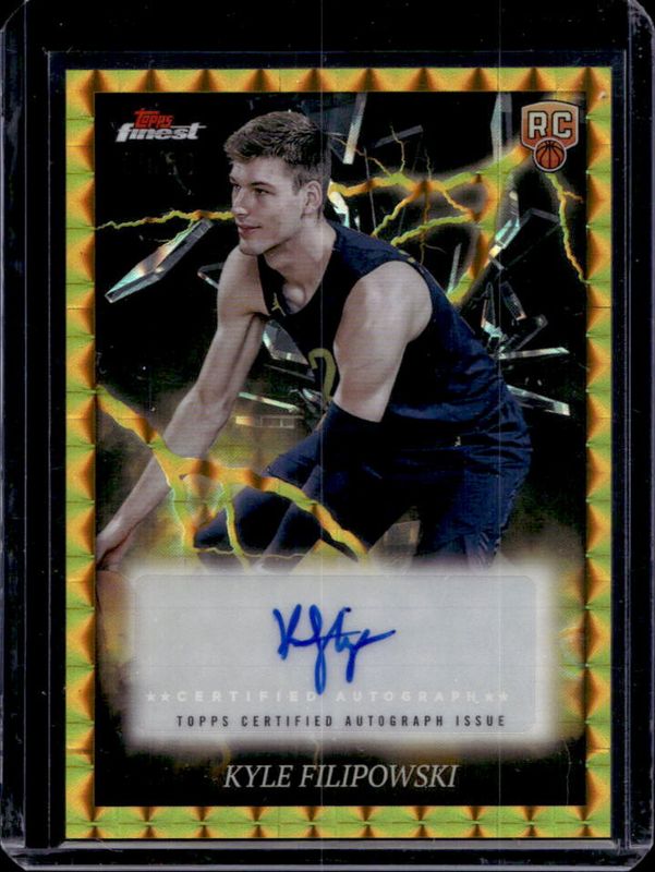 The Kyle Filipowski 2024 Topps Finest #ES-KF Electrifying Signatures - Gold Geometric Refractor /50 Rookie card is 1 of 116 Kyle Filipowski's card variations in the 2024 Topps Finest set being tracked by Sports Card Investor, including Arrivals, Arrivals - Geometric Refractor, Arrivals - Refractor, Arrivals - X-Fractor, and Base Common.