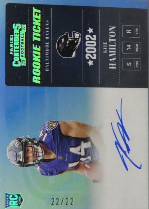 The Kyle Hamilton 2022 Contenders #02RT-KHA 2002 Rookie Ticket Auto /22 card in Raw condition has not changed in price in the last 30 days and was last sold for $43.89 .