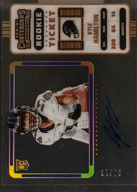 This card is 1 of 30 Kyle Hamilton's card variations in the 2022 Contenders set being tracked by Sports Card Investor, including Rookie Ticket Auto, Rookie Ticket Auto - Red Zone Ticket, Rookie Ticket Auto - Silver (/49), Rookie Ticket Auto - Ticket Stub (/14), and Rookie Ticket Auto - Wild Card.