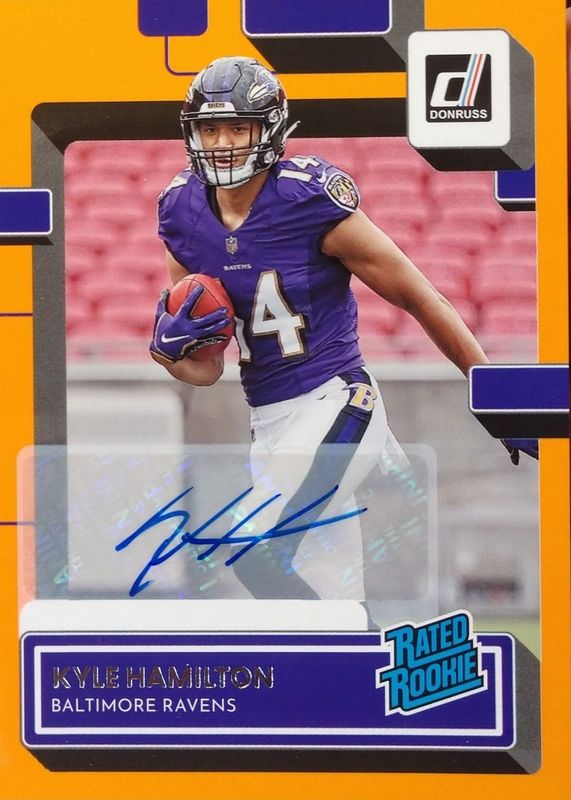 The Kyle Hamilton 2022 Donruss #338 Rated Rookie Autographs - Orange card in Raw condition has not changed in price in the last 30 days and was last sold for $6.50 .