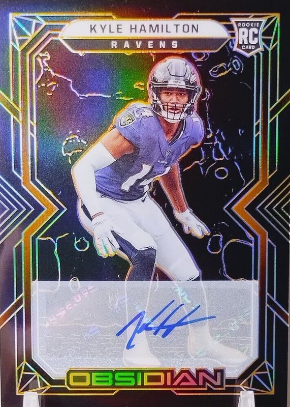 This card is 1 of 7 Kyle Hamilton's card variations in the 2022 Obsidian set being tracked by Sports Card Investor, including Rookie Autographs (/199), Rookie Autographs - Electric Etch Green /50, Rookie Autographs - Electric Etch Yellow /25, Rookie Autographs - Electric Etch Red /10, and Rookie Autographs - Electric Etch Red Flood /6.