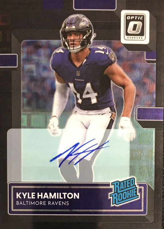 The Kyle Hamilton 2022 Optic #238 Rated Rookie Autographs - Black Pandora /25 card in Raw condition has not changed in price in the last 30 days and was last sold for $127.50 .
