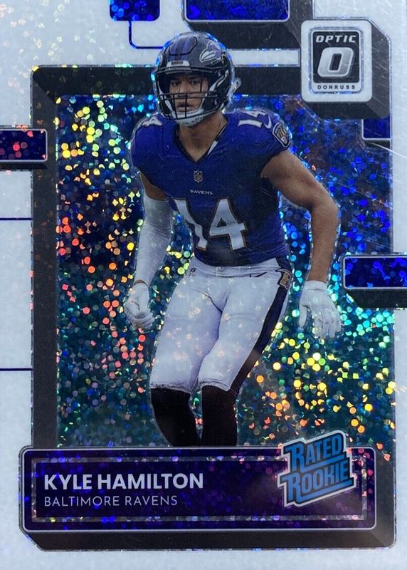 The Kyle Hamilton 2022 Optic #238 White Sparkle /(SSP) Rookie card in Raw condition has not changed in price in the last 30 days and was last sold for $33.50 .