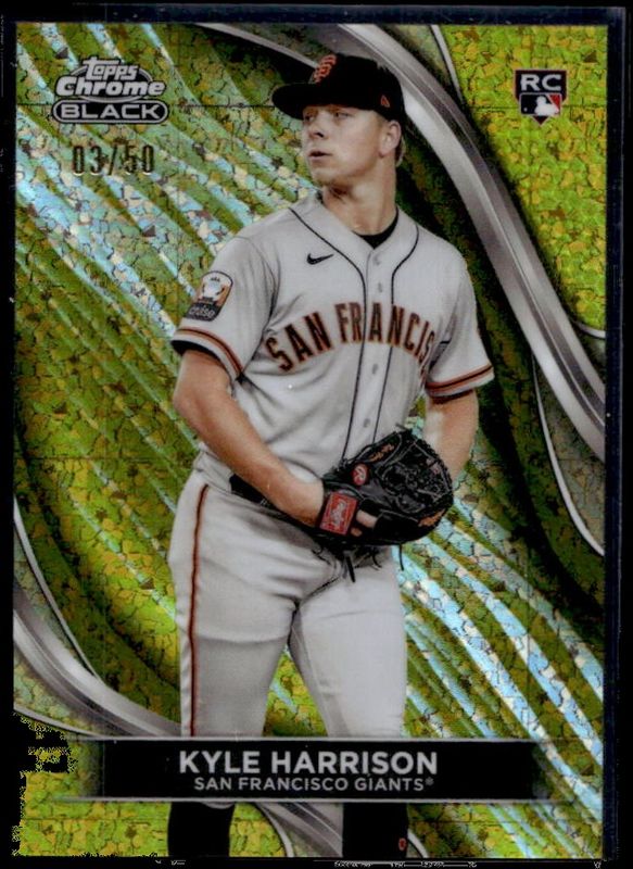 The Kyle Harrison 2024 Topps Chrome Black #91 Gold Mini-Diamond Refractor /50 Rookie card is 1 of 22 Kyle Harrison's card variations in the 2024 Topps Chrome Black set being tracked by Sports Card Investor, including Base, Refractor /199, Purple Mini-Diamond Refractor /150, Green Refractor /99, and Green Wave Refractor /99.