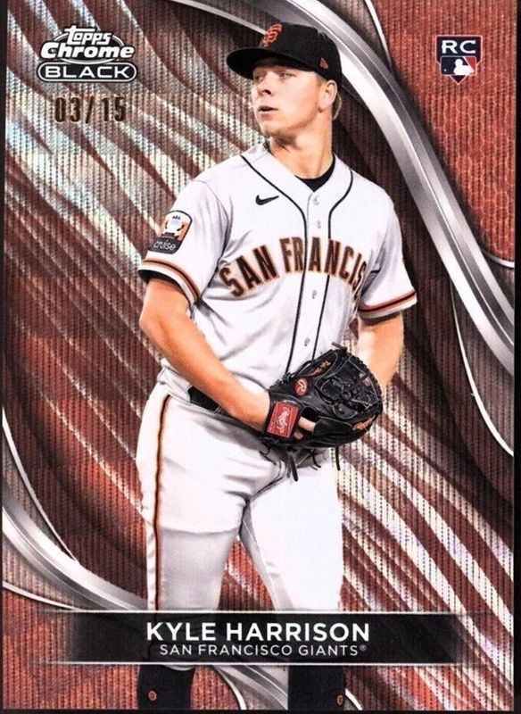 The Kyle Harrison 2024 Topps Chrome Black #91 Rose Gold Wave Refractor /15 Rookie card is 1 of 22 Kyle Harrison's card variations in the 2024 Topps Chrome Black set being tracked by Sports Card Investor, including Base, Refractor /199, Purple Mini-Diamond Refractor /150, Green Refractor /99, and Green Wave Refractor /99.