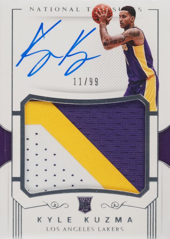This card is 1 of 9 Kyle Kuzma's card variations in the 2017 National Treasures set being tracked by Sports Card Investor, including Rookie Patch Auto - Bronze /25, Rookie Patch Auto - Limited Edition FOTL /15, Rookie Patch Auto - Gold /10, Rookie Patch Auto - Emerald /5, and Rookie Patch Auto - Logoman /1.