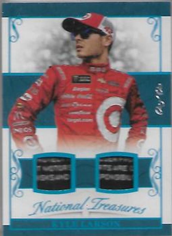 The Kyle Larson 2017 National Treasures NASCAR #DFM-KL Dual Firesuit Materials Laundry Tags /1 card is 1 of 91 Kyle Larson's card variations in the 2017 National Treasures NASCAR set being tracked by Sports Card Investor, including Dual Firesuit Signatures /25, Dual Firesuit Signatures Holo Silver /20, Dual Firesuit Signatures Gold /15, Dual Sheet Metal Materials Gold /15, and Three Wide Gold /15.