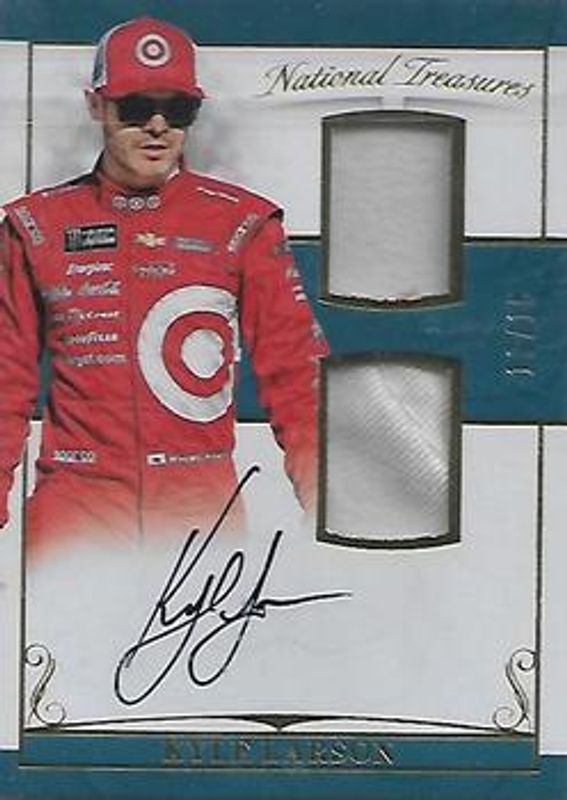 The Kyle Larson 2017 National Treasures NASCAR #DFS-KL Dual Firesuit Signatures Gold /15 card is 1 of 91 Kyle Larson's card variations in the 2017 National Treasures NASCAR set being tracked by Sports Card Investor, including Dual Firesuit Signatures /25, Dual Firesuit Signatures Holo Silver /20, Dual Sheet Metal Materials Gold /15, Three Wide Gold /15, and Hats Off /13.