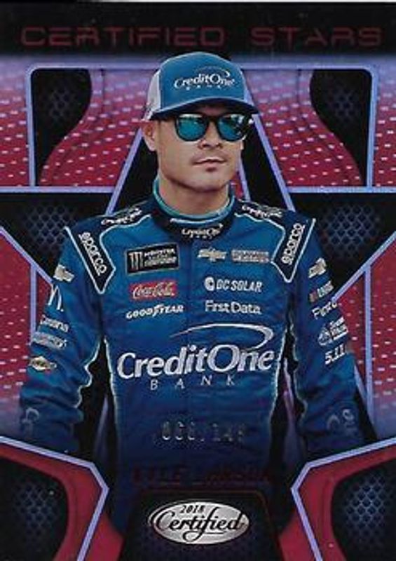 The Kyle Larson 2018 Certified NASCAR #CS19 Certified Stars - Red /149 card is 1 of 90 Kyle Larson's card variations in the 2018 Certified NASCAR set being tracked by Sports Card Investor, including Base /149, Orange /249, Mirror Gold /25, Red /25, and Blue /20.