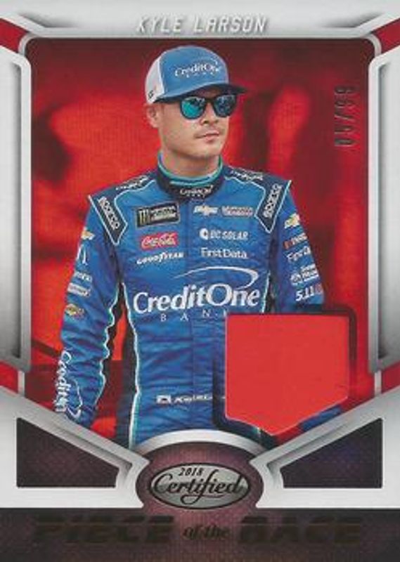 The Kyle Larson 2018 Certified NASCAR #POTR-KL Piece of the Race Relics - Red /199 card is 1 of 90 Kyle Larson's card variations in the 2018 Certified NASCAR set being tracked by Sports Card Investor, including Base /149, Orange /249, Mirror Gold /25, Red /25, and Blue /20.