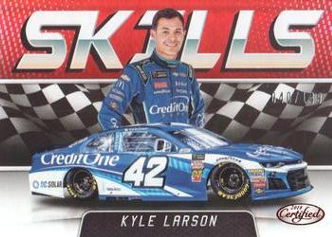 The Kyle Larson 2018 Certified NASCAR #S15 Skills - Red /149 card is 1 of 90 Kyle Larson's card variations in the 2018 Certified NASCAR set being tracked by Sports Card Investor, including Base /149, Orange /249, Mirror Gold /25, Red /25, and Blue /20.