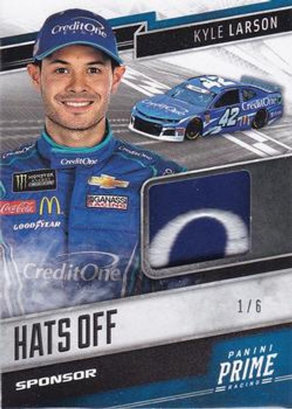 The Kyle Larson 2019 Prime NASCAR #HO-KL Hats Off Sponsor Logo /5 card is 1 of 87 Kyle Larson's card variations in the 2019 Prime NASCAR set being tracked by Sports Card Investor, including #55 Base /50, #84 Base /50, #27 Base /50, #55 Black /10, and #27 Black /10.