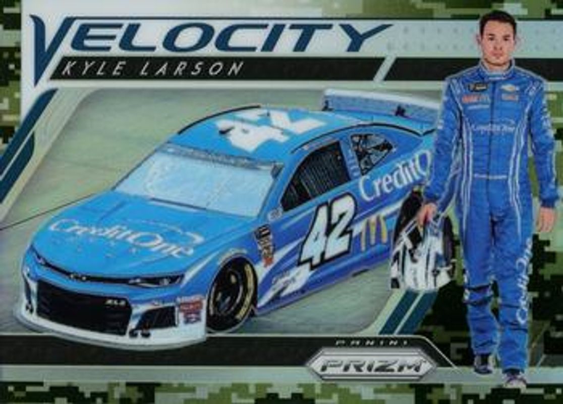 The Kyle Larson 2019 Prizm NASCAR #80 Camo card is 1 of 52 Kyle Larson's card variations in the 2019 Prizm NASCAR set being tracked by Sports Card Investor, including #27 Base, #80 Base, #27 Camo, #27 Purple Flash (Hobby), and #80 Purple Flash (Hobby).
