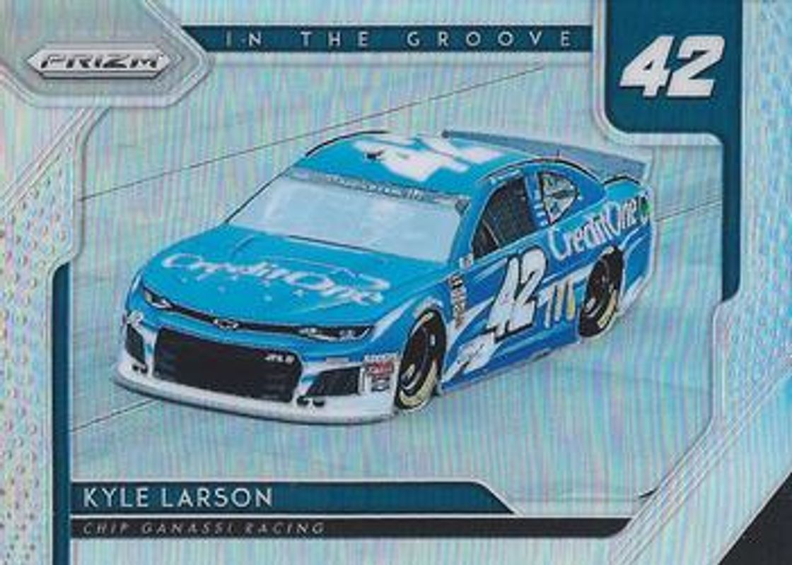 The Kyle Larson 2019 Prizm NASCAR #ITG-11 In the Groove card is 1 of 52 Kyle Larson's card variations in the 2019 Prizm NASCAR set being tracked by Sports Card Investor, including #27 Base, #80 Base, #80 Camo, #27 Camo, and #27 Purple Flash (Hobby).