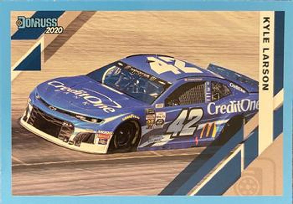 The Kyle Larson 2020 Donruss NASCAR #110 Carolina Blue card is 1 of 95 Kyle Larson's card variations in the 2020 Donruss NASCAR set being tracked by Sports Card Investor, including #110 Base, #43 Base, #162 Base, #13 Base, and #43 Carolina Blue.