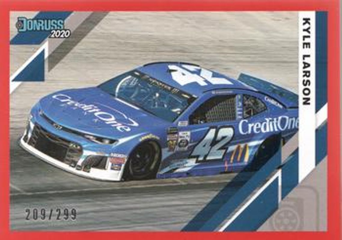 The Kyle Larson 2020 Donruss NASCAR #110 Red /299 card is 1 of 95 Kyle Larson's card variations in the 2020 Donruss NASCAR set being tracked by Sports Card Investor, including #110 Base, #43 Base, #162 Base, #13 Base, and #43 Carolina Blue.